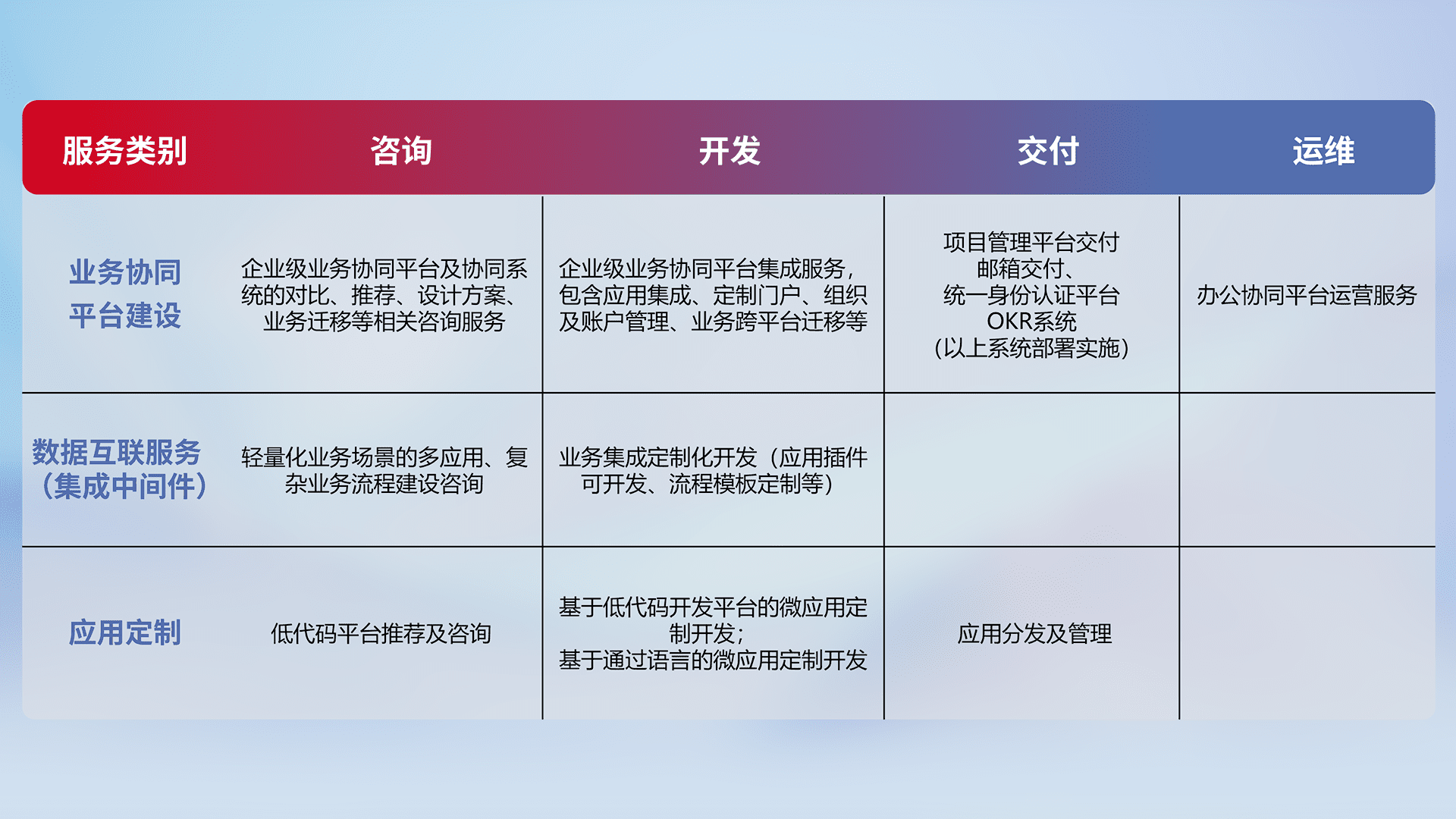 针对钉钉、、、、企微、、、IDaas等平台级产品提供产品的规划、、方案、、、、交付、、定制化开发等服务,,实现如统一协同办公、、、智能客户服务、、、混合会议管理、、、、智能数据查询、、、、等业务场景,,,实现数字化转型。。。